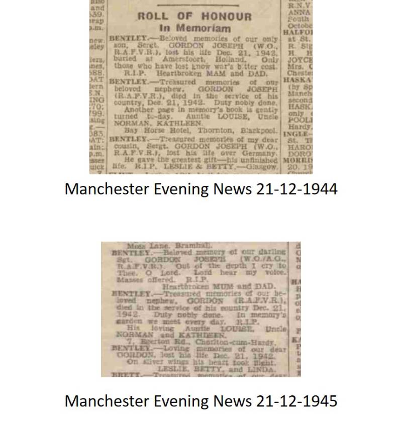 Veel onderzoek brachten geen losse eindjes bij elkaar. Op de website "Findagrave" vond ik het graf van Thomas en Norah Gladys Bentley op het "Southern Cemetery" in Chorlton(Manchester). Enkele berichten op een lokale FaceBook pagina trokken de aandacht van de BBC NorthWest en er was email correspondentie met hen. In 2016 maakten we een reis door Engeland en we besloten naar de begraafplaats in Chorlton te gaan. Misschien was er meer informatie te vinden op de grafsteen. BBC NorthWest Tonight maakte opnames op de begraafplaats en dat werd die avond uitgezonden. op die uitzending kwam één reactie. Dat bracht geen direct resultaat maar wel contact met Di Ablewhite, onderzoeker en vrijwilliger bij het "International Bomber Command Centre". Zij is zeer behulpzaam bij meerdere moeilijke onderzoeken en dat heeft ook al tot belangrijke resultaten geleid.