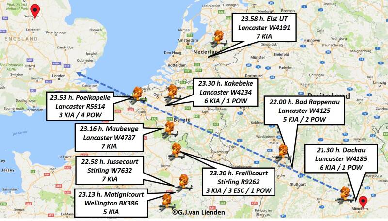 On the left image the planned route for the bombers from the different RAF bases in England to Munich, but now on a modern map.