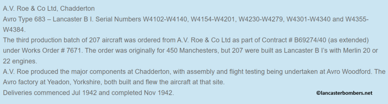 Lancaster W4191 was part of an order for 450 Manchesters. Due to the problems with the Manchester this order was changed and 207 Lancasters were built.