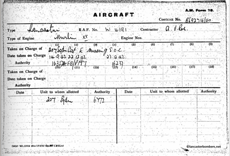 Lancaster W4191 werd op 14 september 1942 overgedragen aan 207 Squadron zoals te zien op de stamkaart hier boven. Het squadron was op dat moment gestationeerd op RAF Bottesford. Kort daarna werd het squadron overgeplaatst naar RAF Langar.