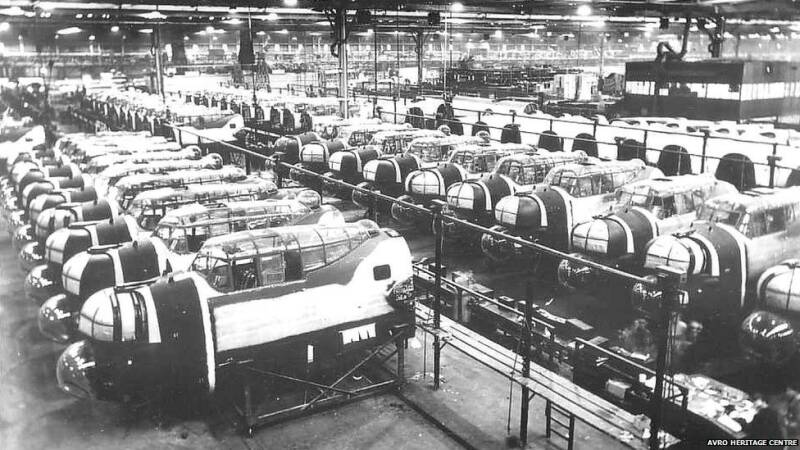 Op de linkse foto een overzicht van de enorme productiehallen van AVRO Chadderton. In Chadderton was geen vliegveld en eindmontage vond plaats op Woodford Aerodrome, ruim 25 kilometer naar het zuiden. Op de foto rechts een transport van componenten naar Woodford.